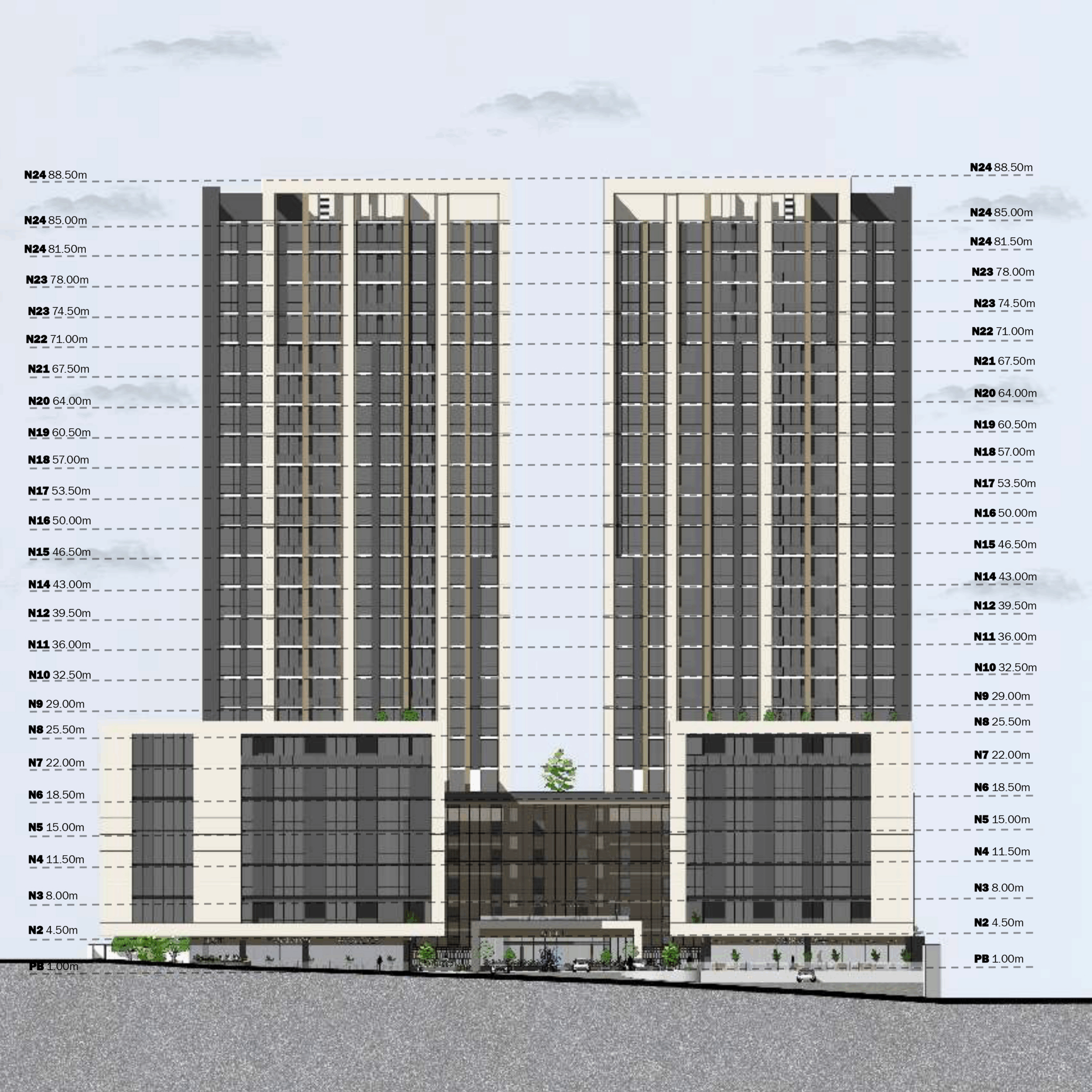 EL PROYECTO CUENTA CON 2 TORRES DE DEPARTAMENTOS, LA TORRE A ES DE 64 DEPARTAMENTOS QUE SE DISTRIBUYEN EN 23 NIVELES. LAS TIPOLOGÍAS DE LAS UNIDADES SE ENCUENTRAN ASIGNADAS DE LA SIGUIENTE MANERA: 62 DEPARTAMENTOS DEL NIVEL N1 AL NIVEL N21, 1 PENTHOUSE EN EL NIVEL N22 Y 1 PENTHOUSE DE DOS PISOS EN EL NIVEL N21 AL N22. LA TORRE B ES DE 46 DEPARTAMENTOS QUE SE DISTRIBUYEN EN 17 NIVELES.